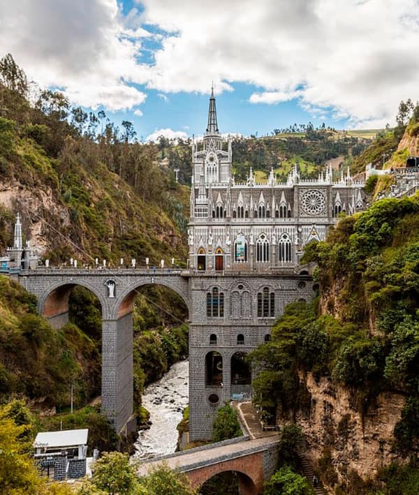 1. Santuario de Las Lajas: Un imponente templo construido en un cañón sobre el río Guáitara.