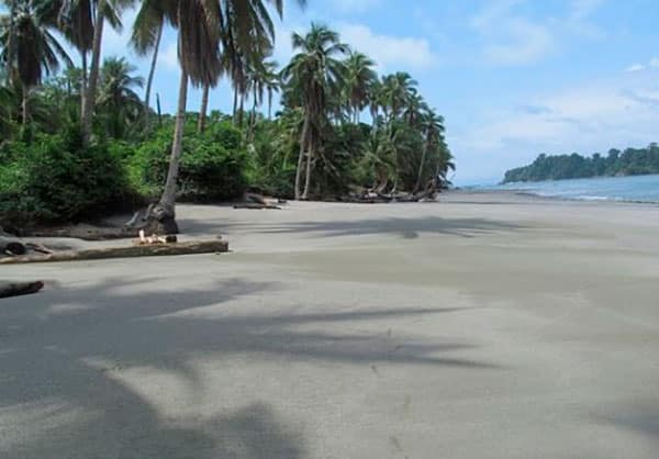 - Playa de arena blanca bordeada por palmeras.